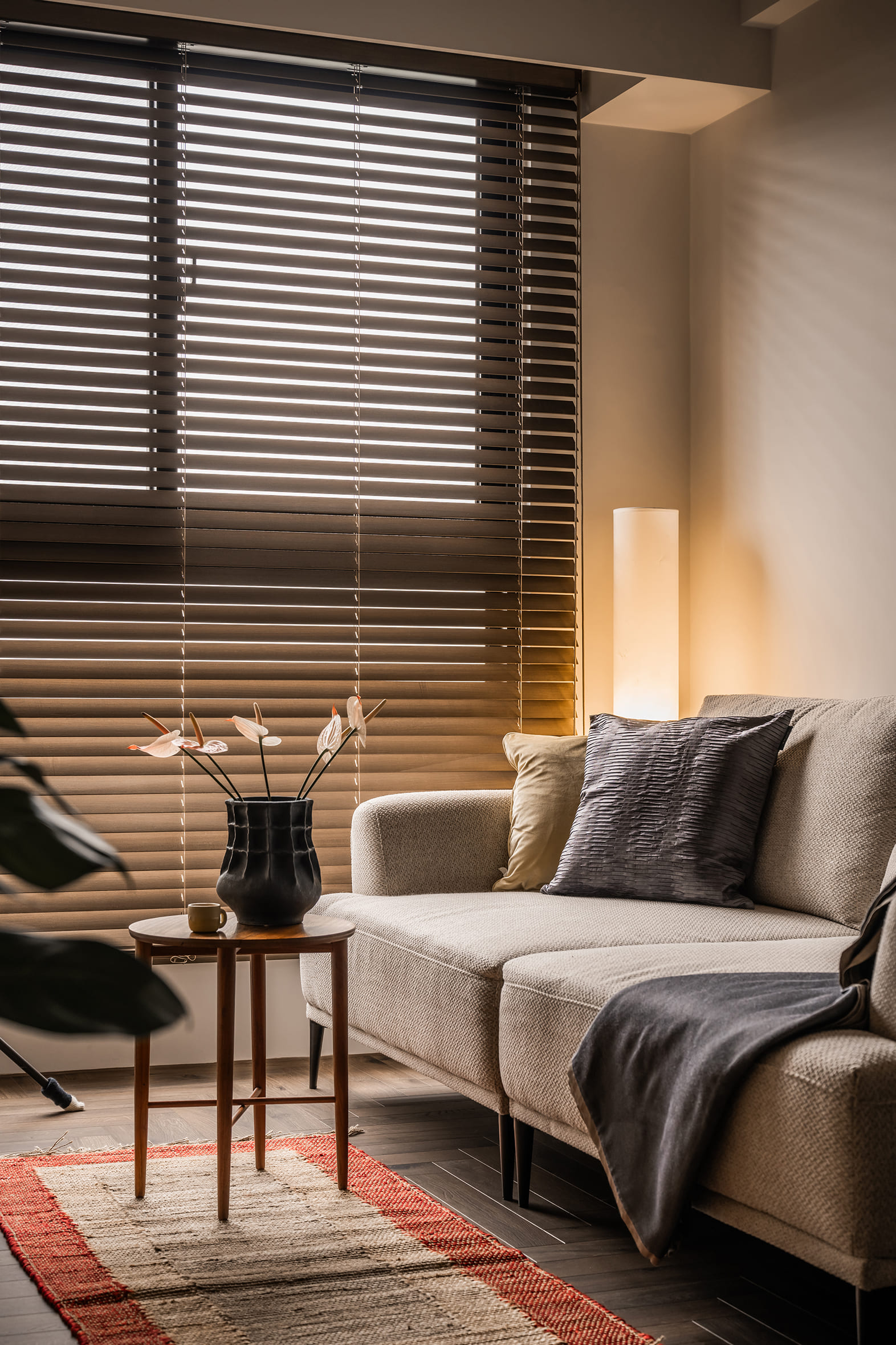 整體設計以黑白及淺木為主調,營造幽寂內斂的低調美感。室內地坪通舖同款淺色地磚,色調連續延展,為僅有十五坪的空間創造視覺放大效果。