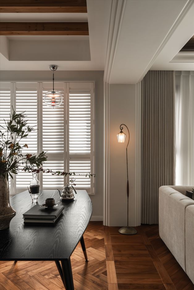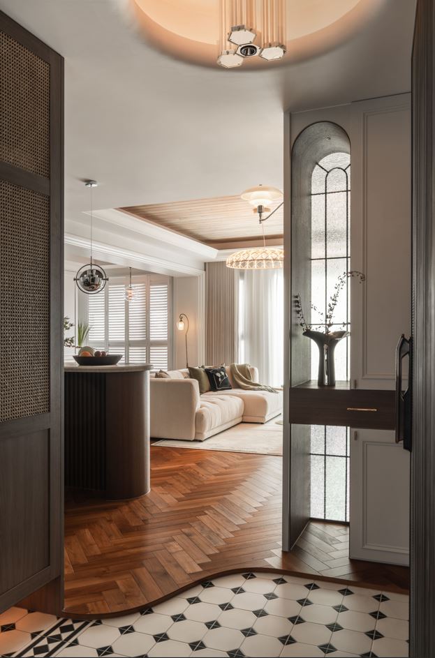 本案以現代與法式語彙重整 12 年新古屋,透過線條、材質與尺度調整,結合清爽木質、訂製鐵件與復古拼花磚,打造優雅且耐看的日常生活空間。