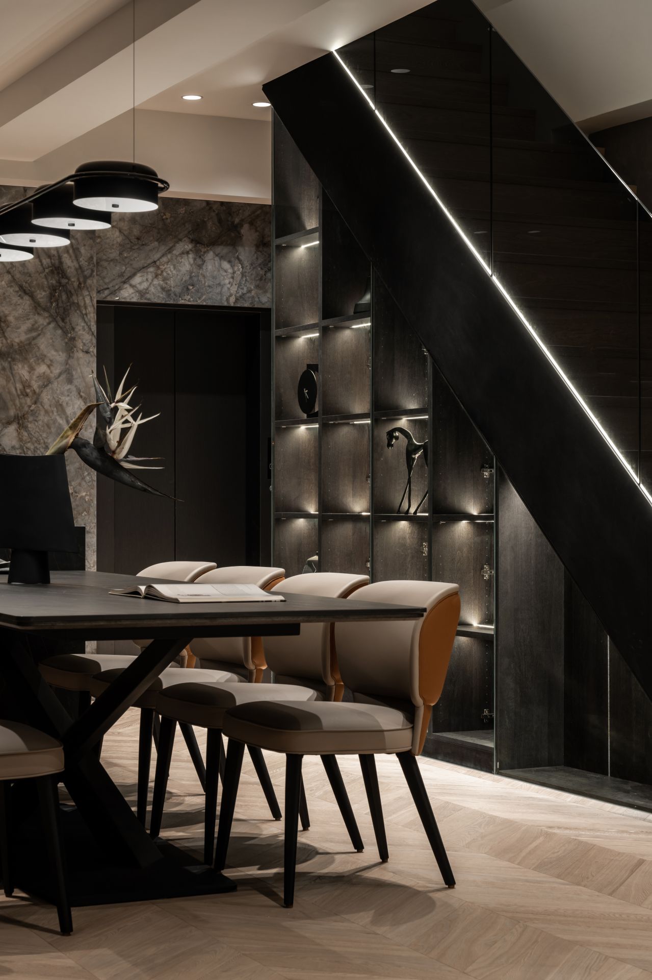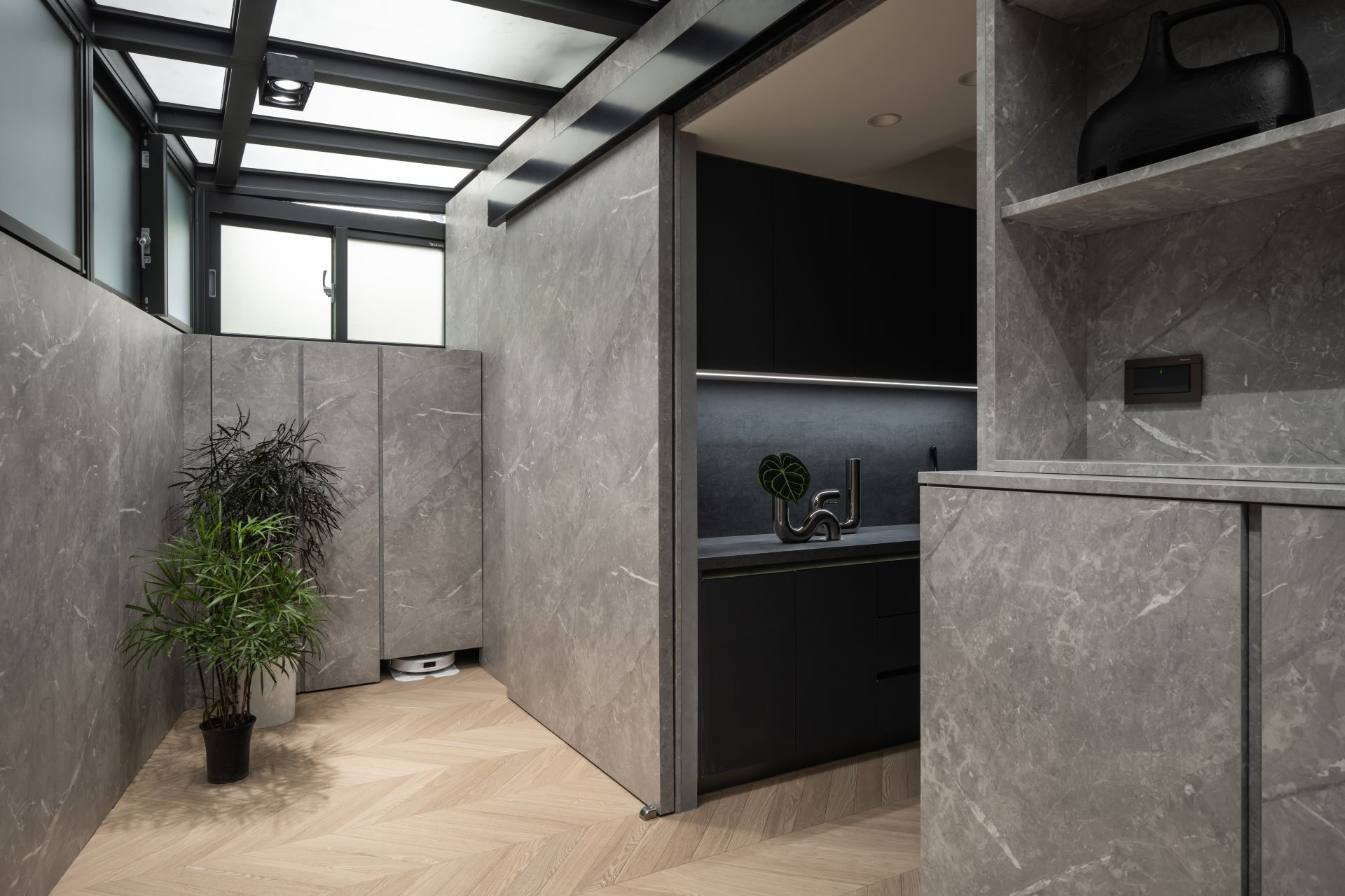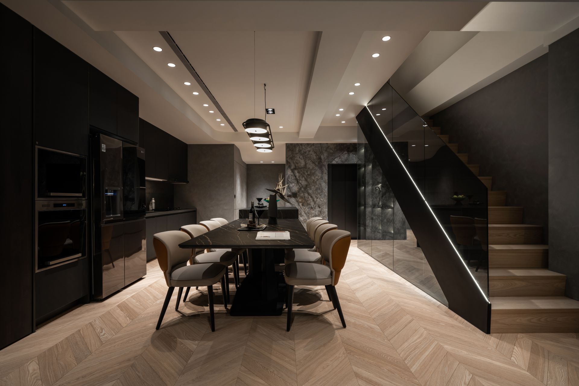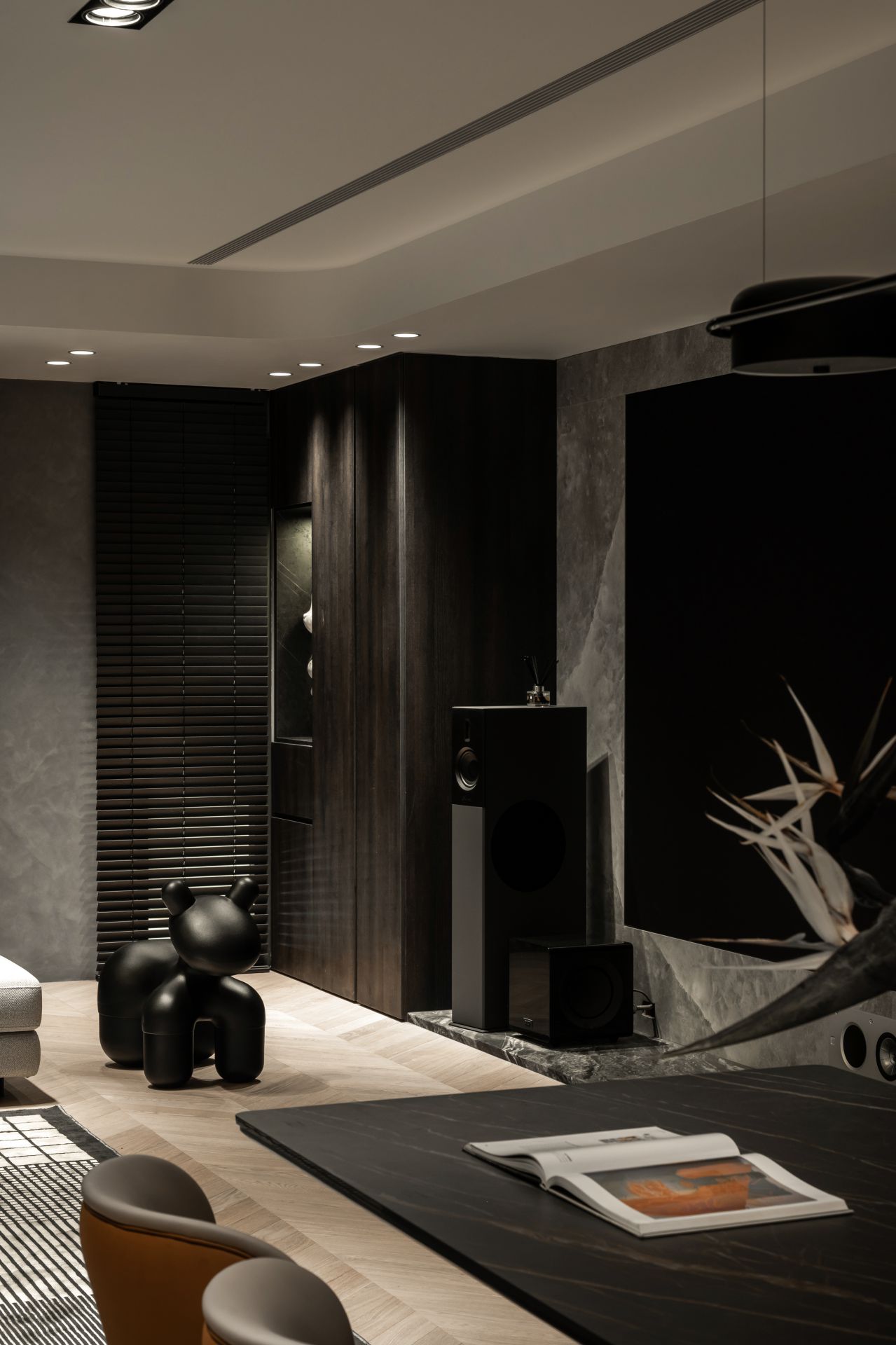 因應屋主需求,設計師將 Apple HomeKit 智能系統融入整體設計,串連全屋燈光、空調、安防與音響系統,實現一鍵掌控。屋主在外時,可遠端控制調整家中環境;回家時,自動啟動的燈光與已經打掃完成的地板,讓生活變得更輕鬆有序。