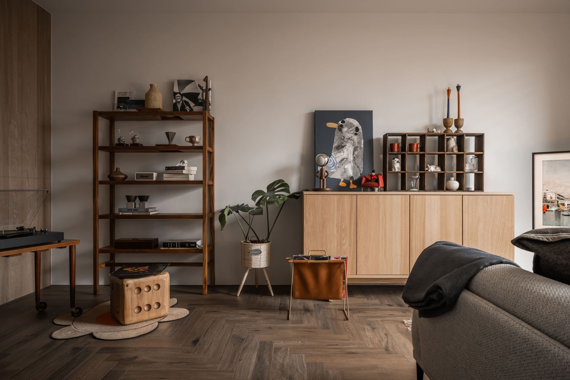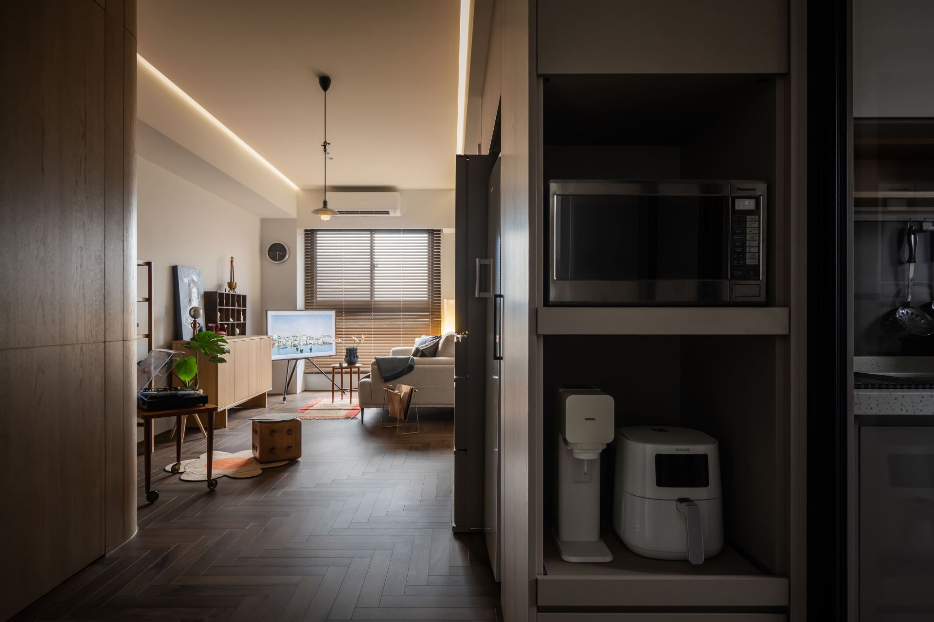 廚房區設置透光玻璃拉門,有效隔離油煙,同時將後陽台自然光引入室內,使整體空間明亮通透。材質運用上,以淺灰牆面、超耐磨人字拼木地板為基底,搭配胡桃木色系系統櫃與柚木實木皮門片,營造溫潤且帶有復古韻味的空間氛圍。