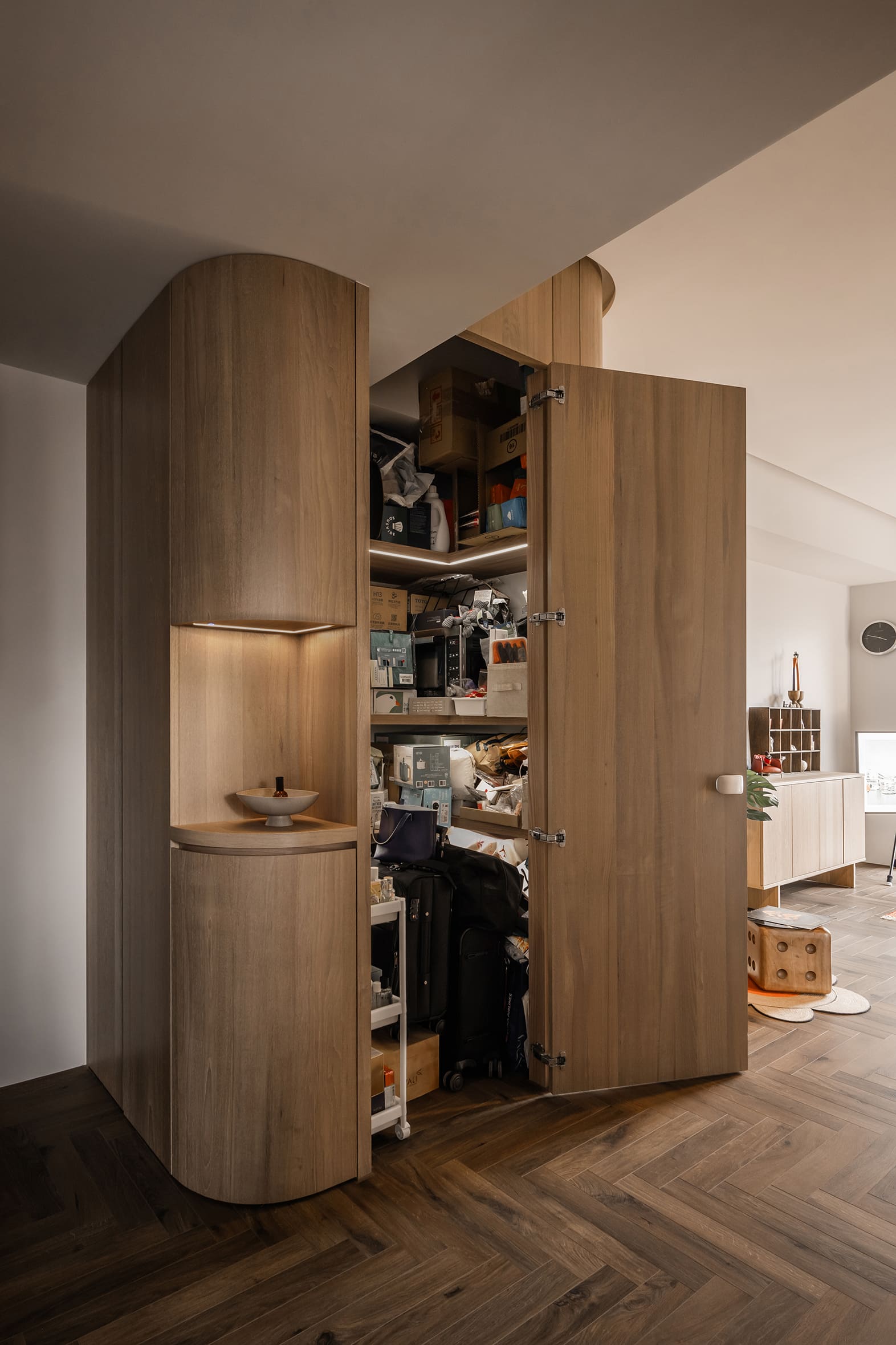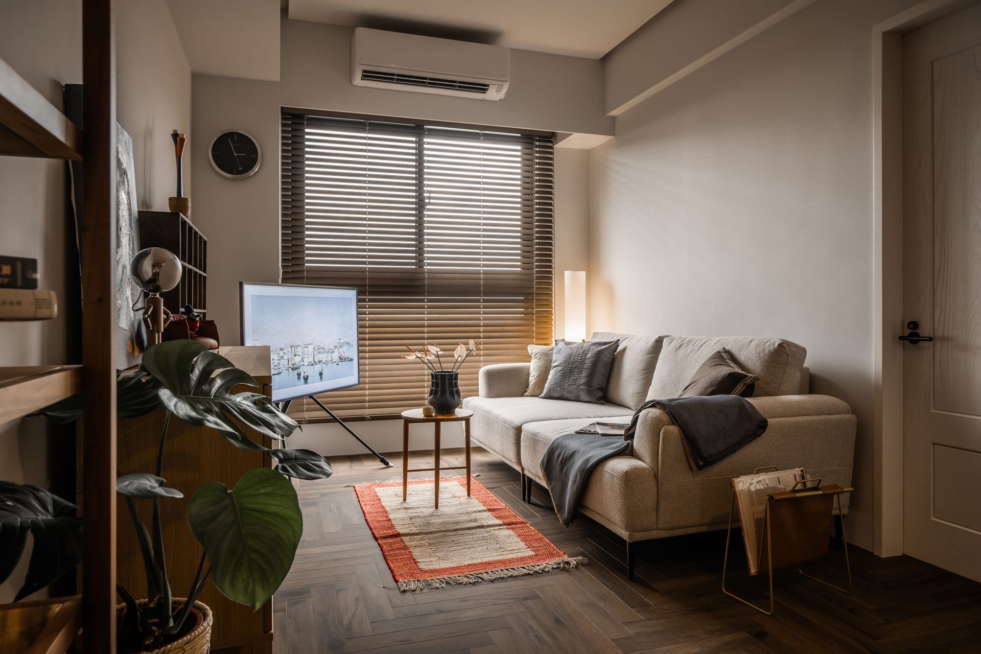 本案室內面積約 20 坪,維持原有三房兩廳兩衛的格局配置,設計以「軟裝設計為主軸」,硬體規劃刻意保留簡潔線條,讓空間回歸生活本質。因應屋主空服員的生活型態,於玄關新增獨立儲物間,集中收納大型行李與工作用品,使公共區域維持整潔有序,並形塑回家的儀式感。