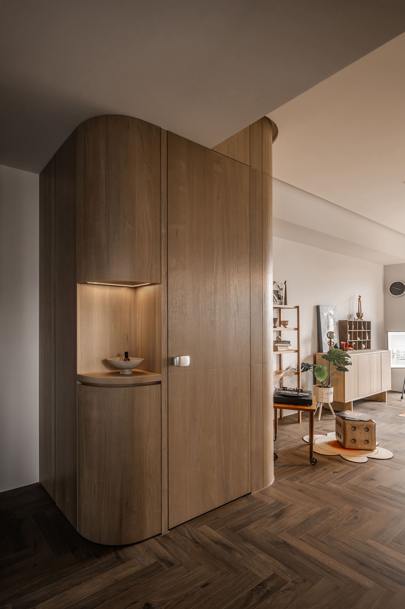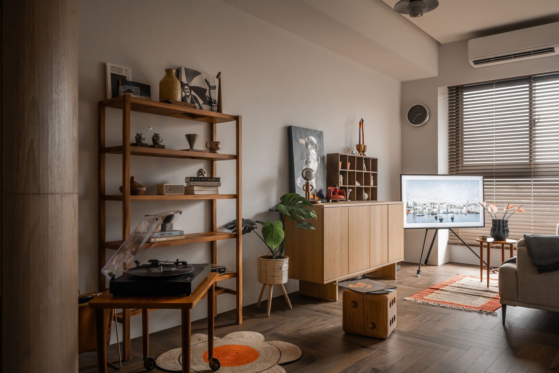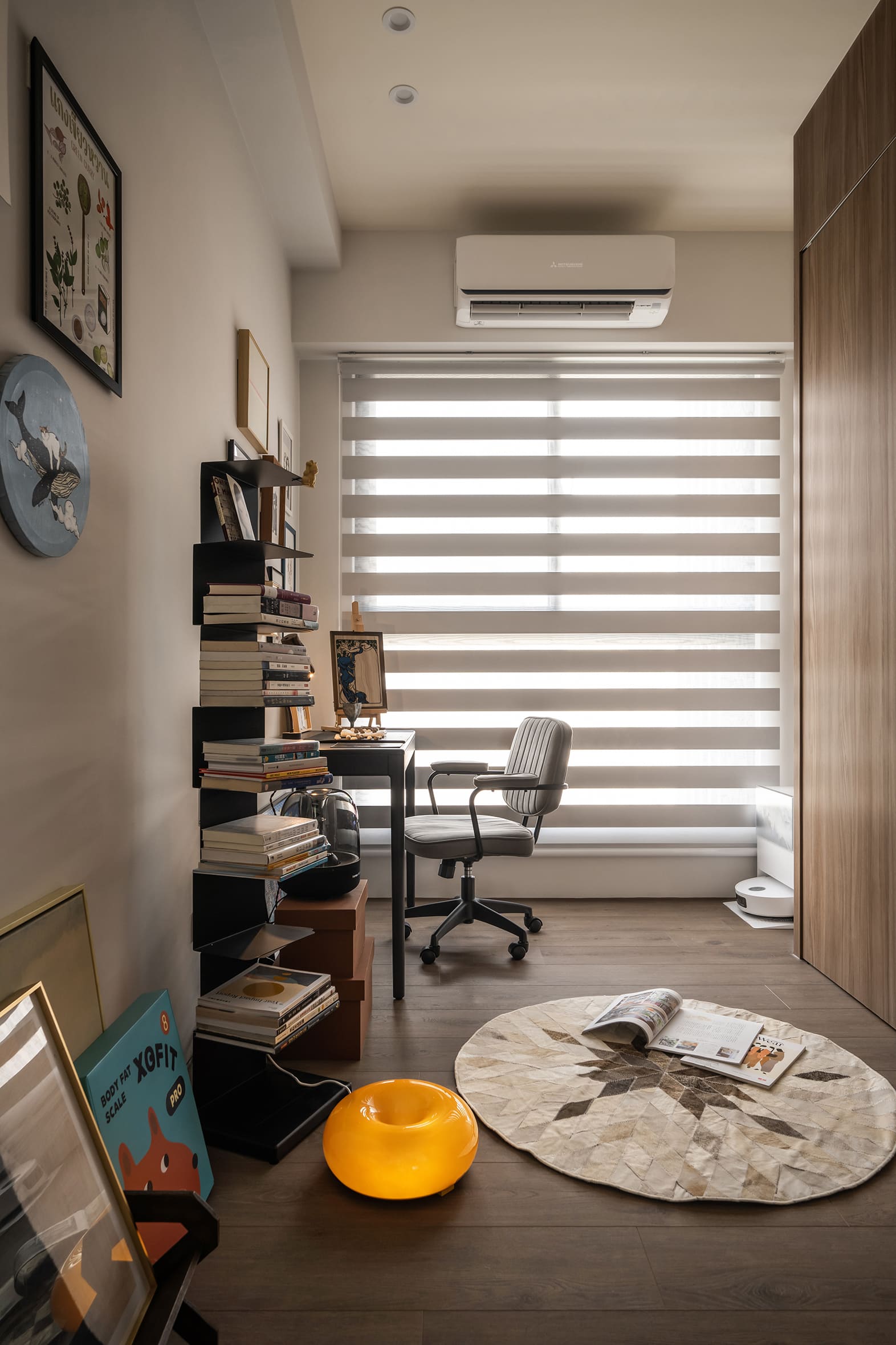 主臥室將衣櫃機能整合至書房空間,透過折門串聯使用情境,提升空間彈性。軟裝配置選用老件實木家具與丹麥原裝燈具,搭配落地電視配置,淡化電視牆存在感。照明以間接光源為主,結合 Apple HomeKit 智能系統,讓燈光隨情境變化,打造層次豐富且具生活溫度的居家空間。
