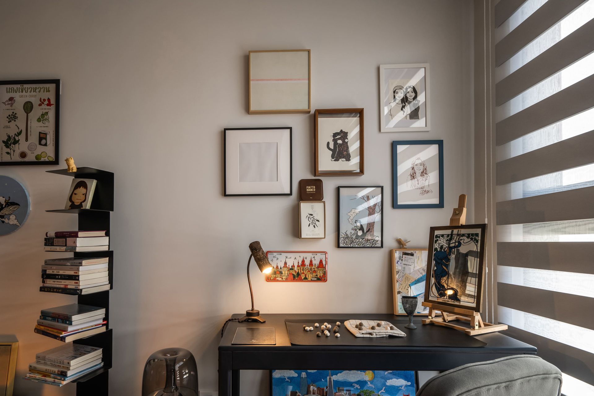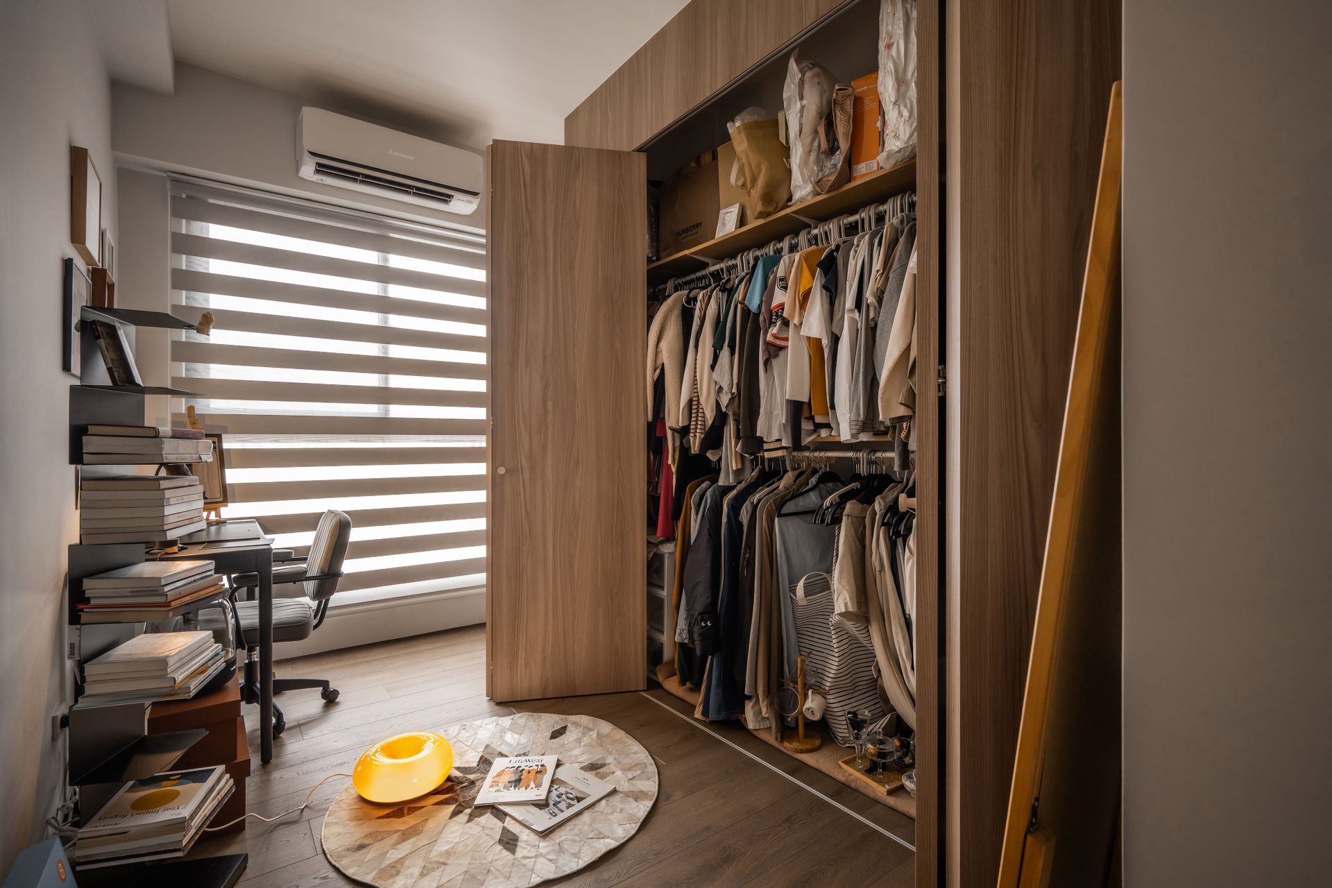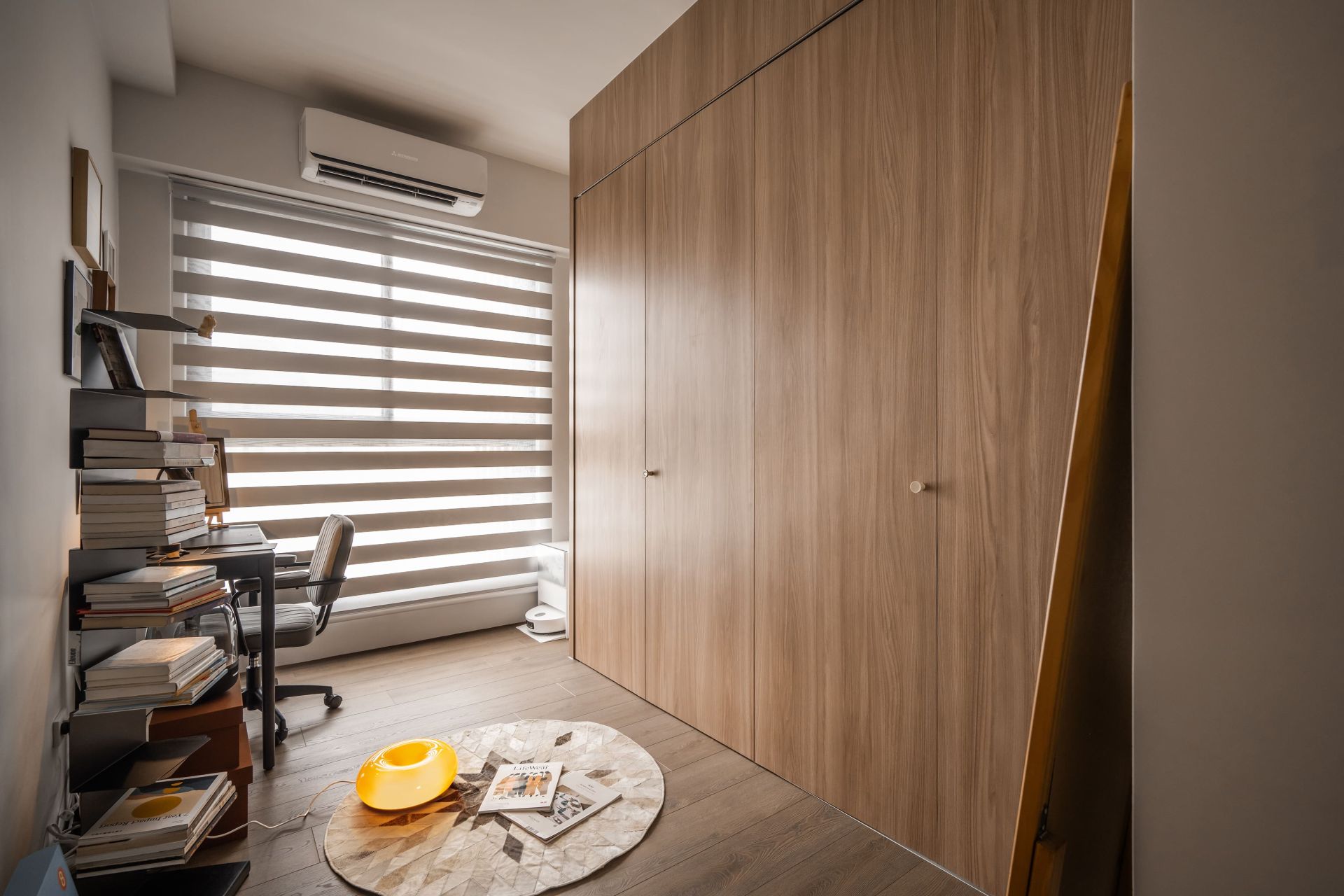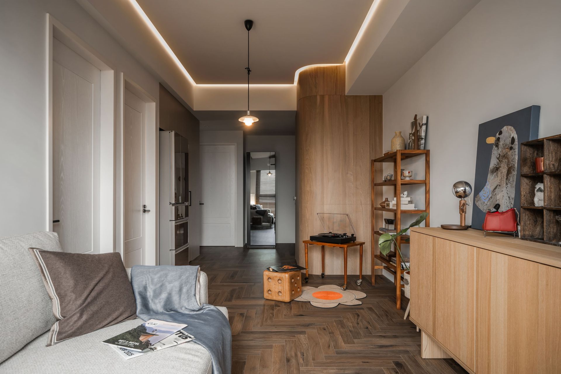 主臥室將衣櫃機能整合至書房空間,透過折門串聯使用情境,提升空間彈性。軟裝配置選用老件實木家具與丹麥原裝燈具,搭配落地電視配置,淡化電視牆存在感。照明以間接光源為主,結合 Apple HomeKit 智能系統,讓燈光隨情境變化,打造層次豐富且具生活溫度的居家空間。