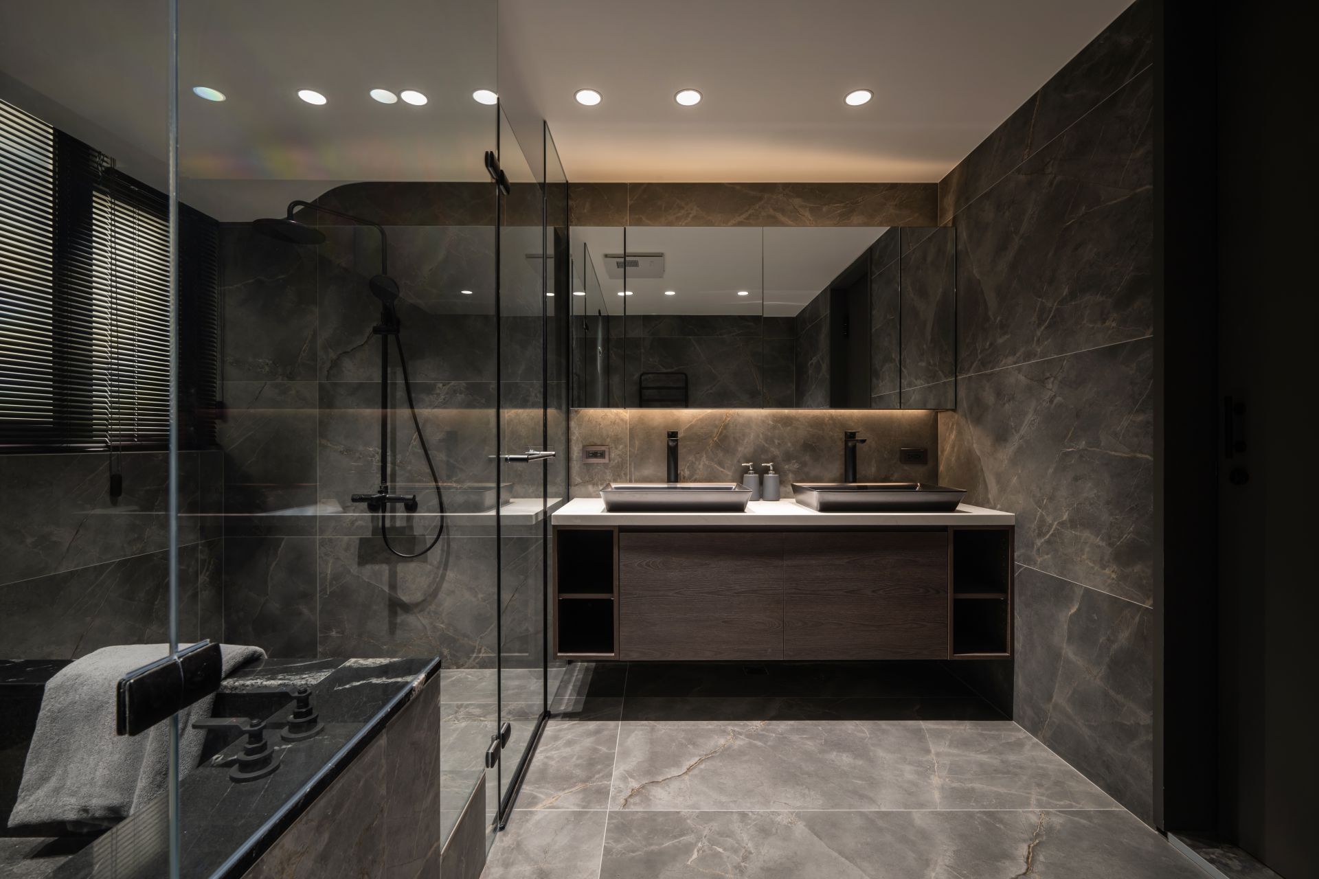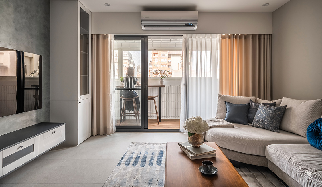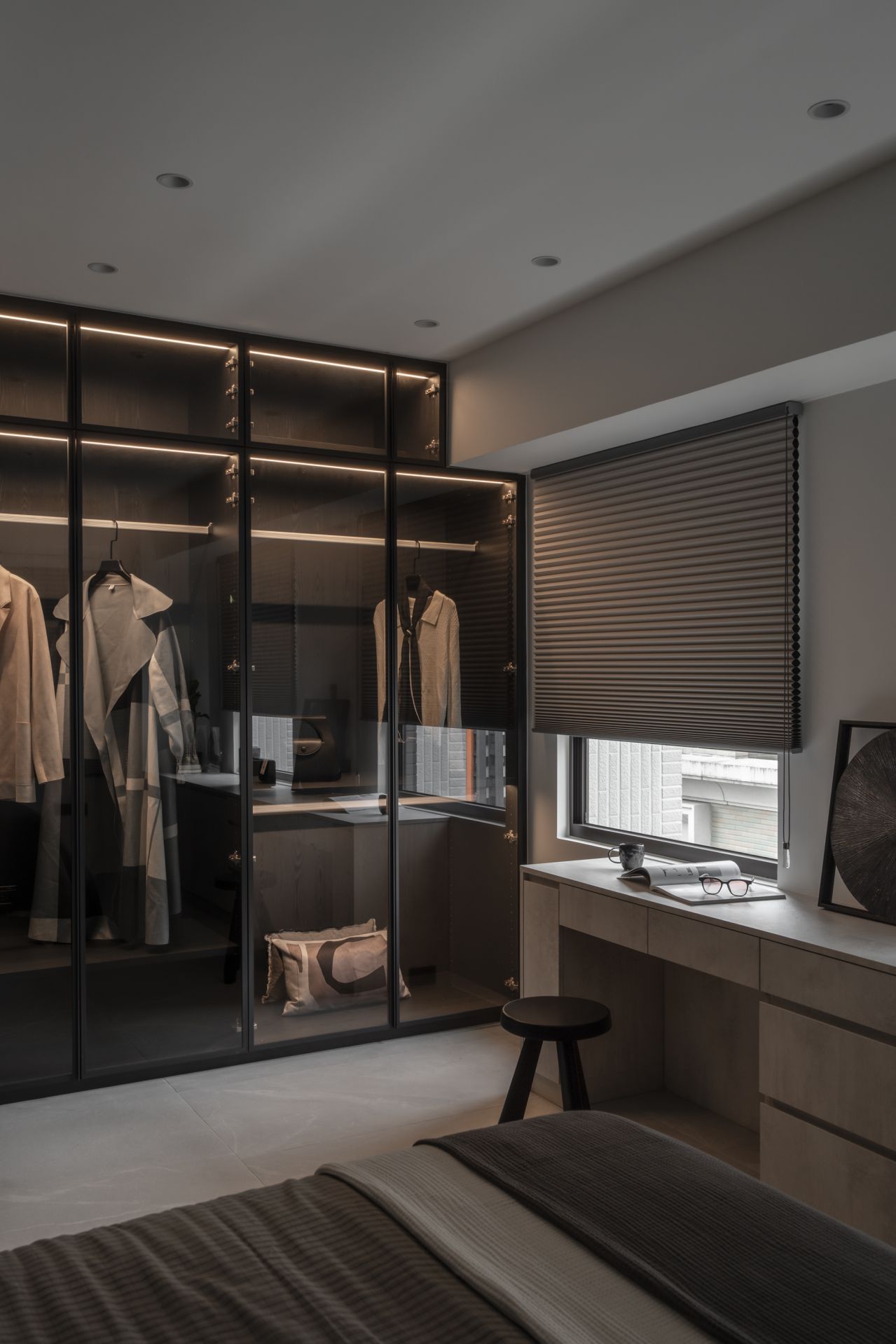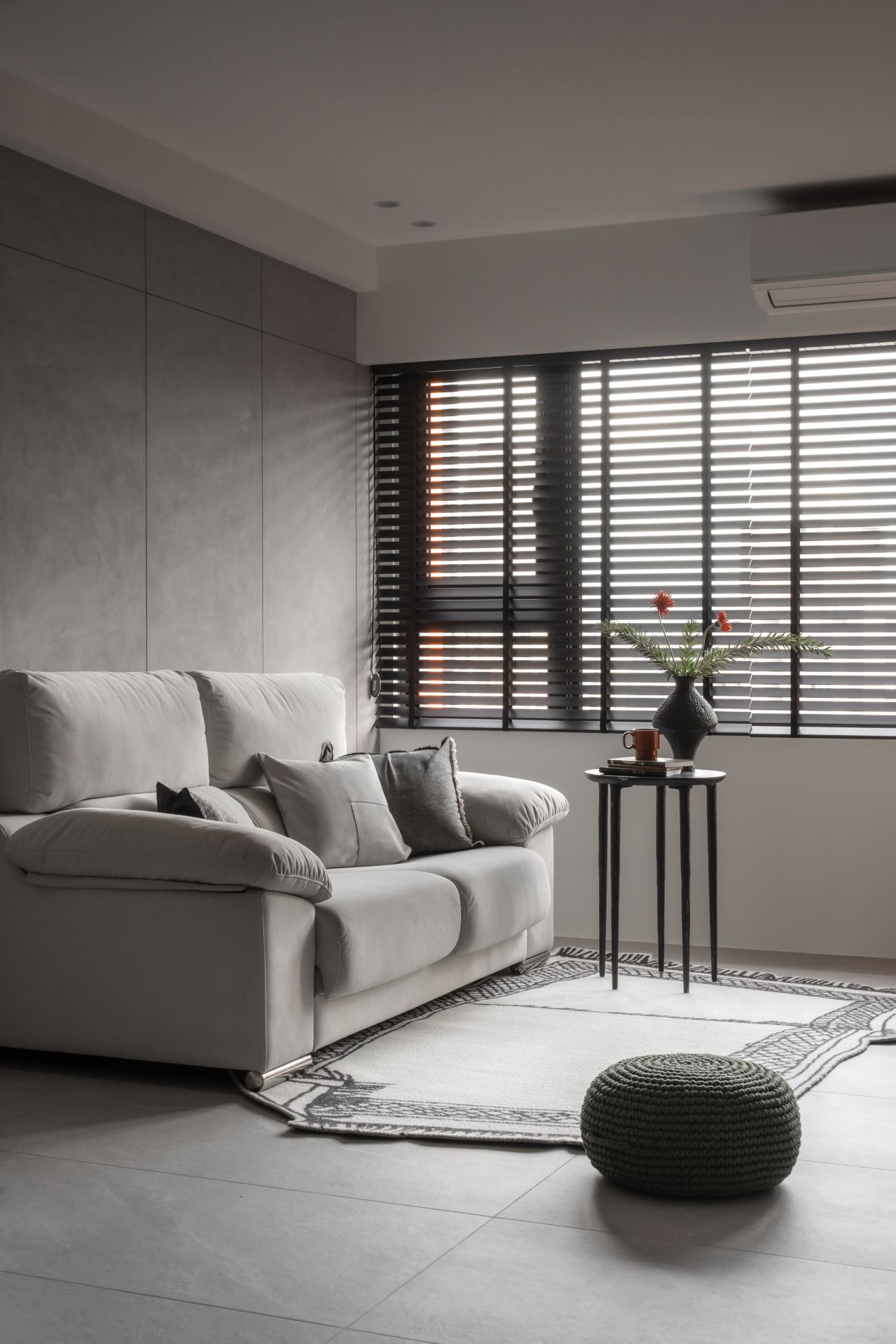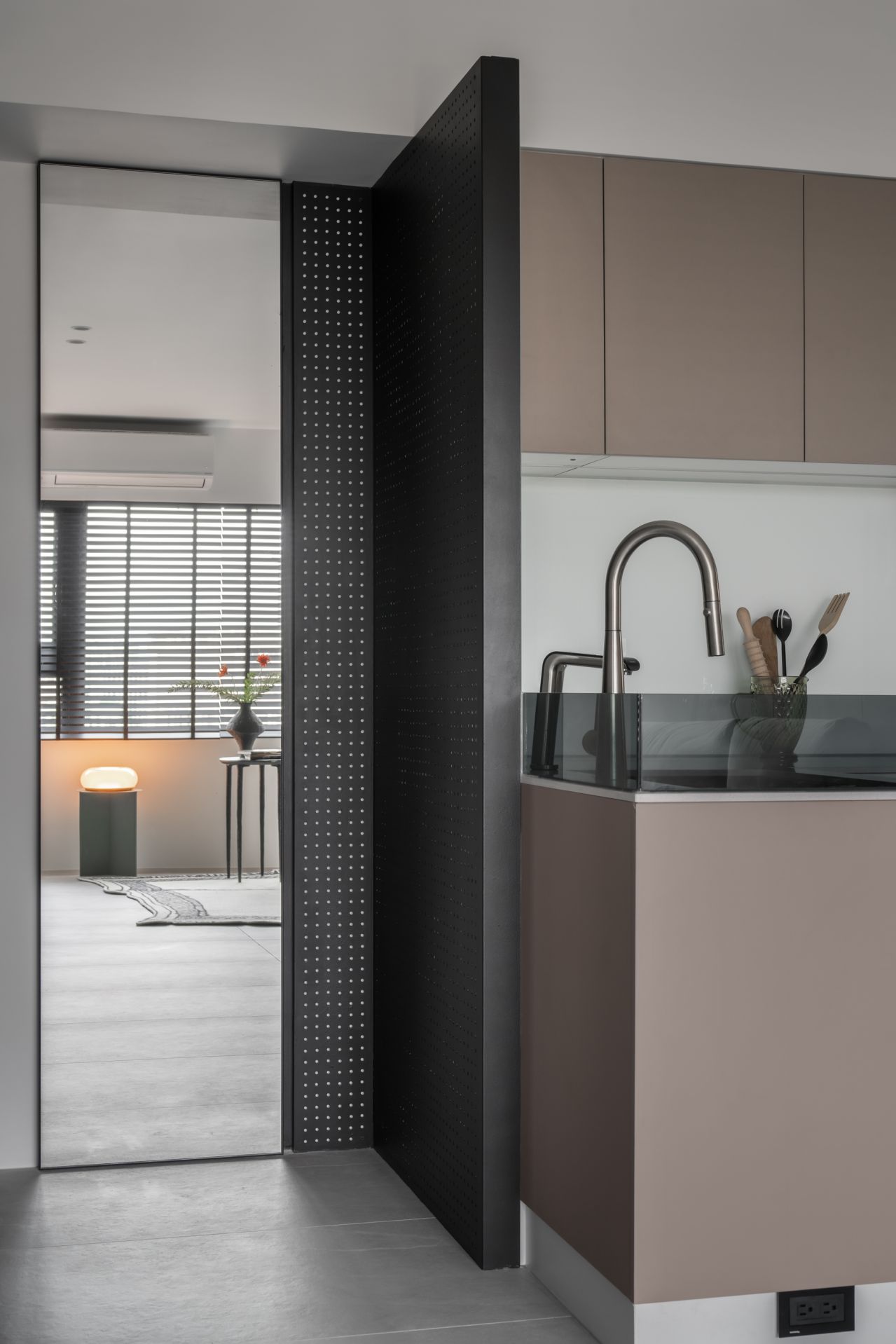 整體設計以黑白及淺木為主調,營造幽寂內斂的低調美感。室內地坪通舖同款淺色地磚,色調連續延展,為僅有十五坪的空間創造視覺放大效果。